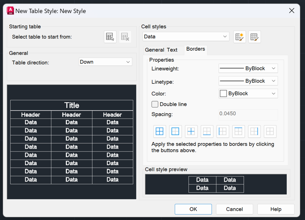 | Borders | – Line Weight (By Layer/By Block/Line Weight) – Line Type (By Layer/By Block/ Line Type) – Color (By Layer/By Block/Color) – Double Line (Yes or No) – Border Options | ![]() |